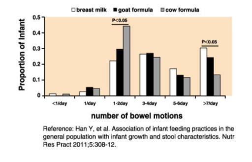 研究顯示:喝配方牛奶寶寶的腸蠕動次數,大多是一天1~2次;而喝母乳的寶寶腸蠕動次數,大多一天多於7次,明顯高於喝配方牛奶的寶寶;而喝配方羊奶的寶寶腸蠕動次數,相較之下與母乳寶寶更相近。寶寶飲用經過調整的配方羊奶,因腸道蠕動較好,羊奶寶寶的便便通常也比較柔軟,較不會有便便不順或脹氣的情形發生(備註2)。羊奶寶寶的腸道菌相好,身體的免疫力相對也會提高。