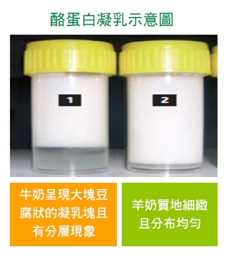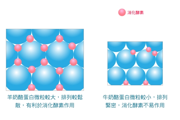 羊奶的酪蛋白以β酪蛋白為主(約佔70%左右),β酪蛋白的特點是含有高比例的脯胺酸,分子呈現比較不定型,而且結構鬆散,所以羊奶的酪蛋白微粒體積較大,微粒子之間的空隙也相對較大,消化酵素比較容易進入,對消化酵素分解能力當然有很大的幫助。