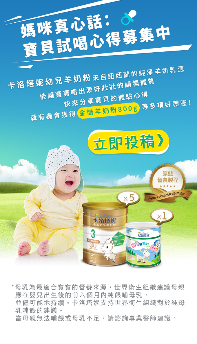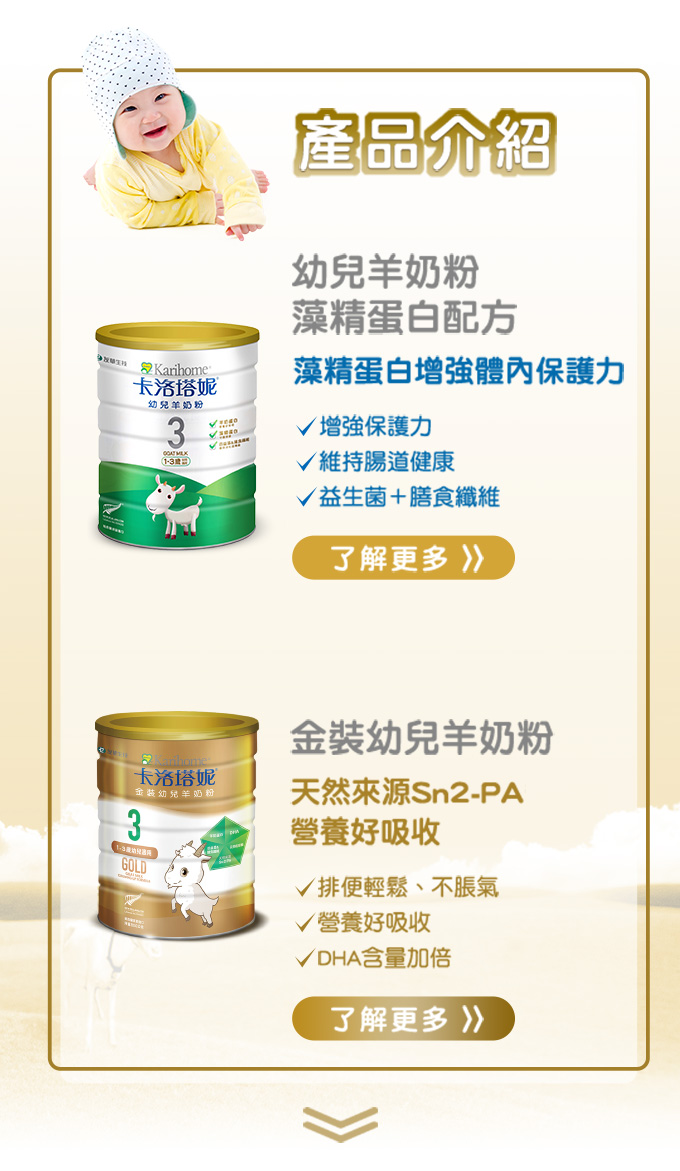 卡洛塔妮的配方奶粉不僅補充了羊鮮奶所缺乏的葉酸和鐵質,更調整了鮮羊奶過量的蛋白質和礦物質(鈣, 磷, 氯, 鈉, 鉀) ,讓配方更符合寶寶長期的營養需求。