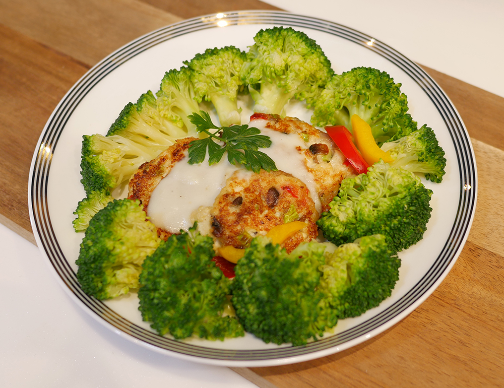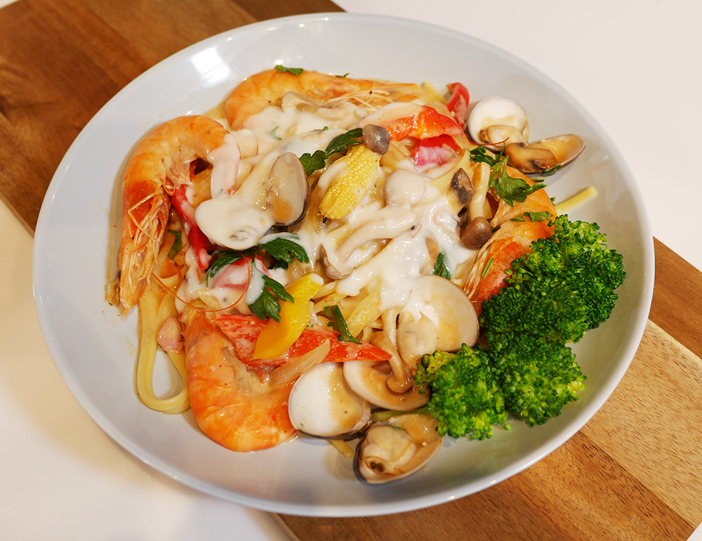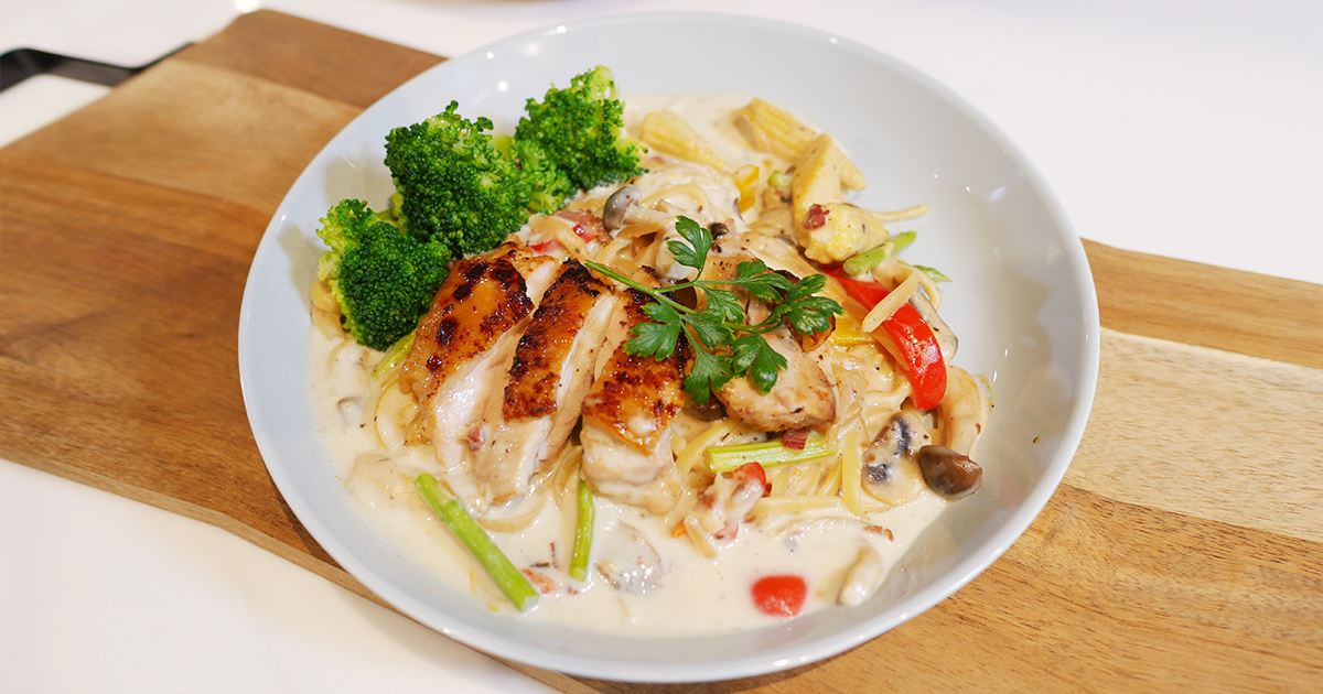 06.最後,加入白醬、少許煮麵水調整味道,拌炒均勻即可熄火盛盤,擺上切好的香煎嫩雞、灑上巴西里或羅勒即可享用。