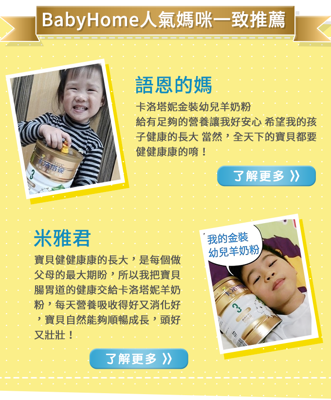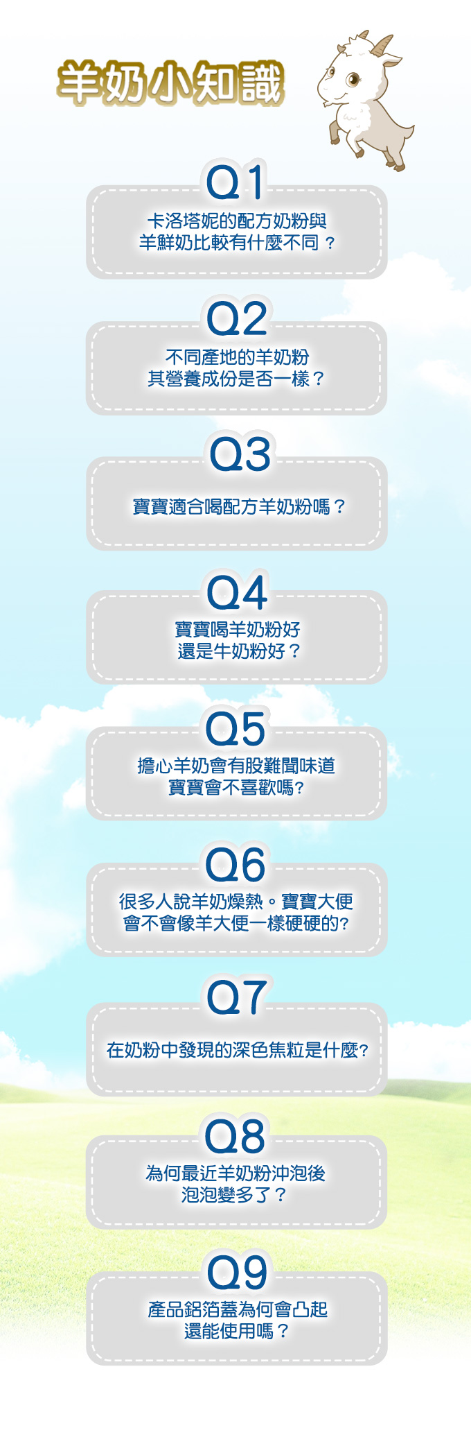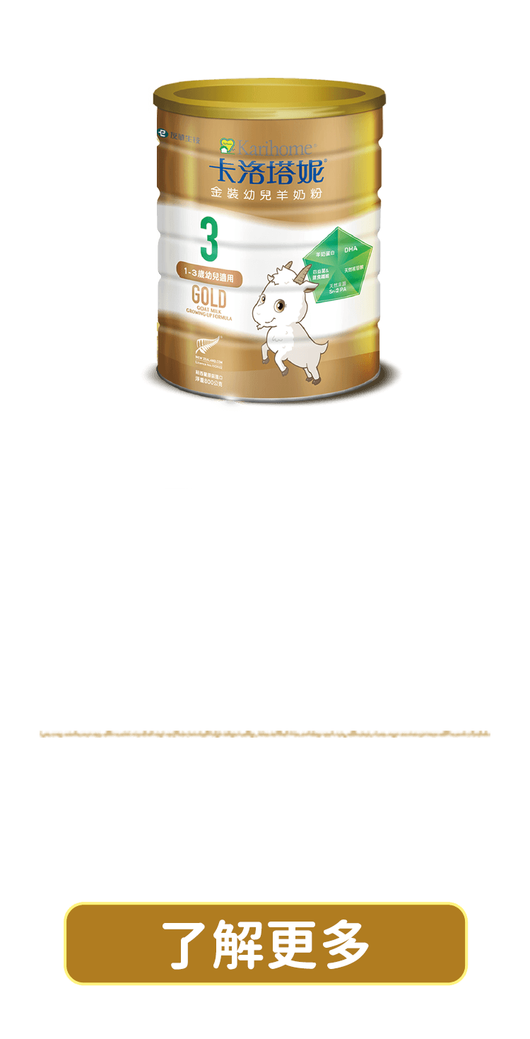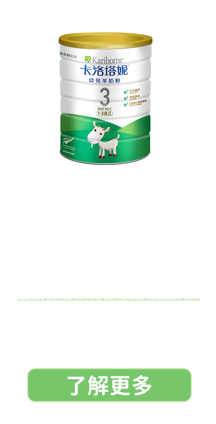 卡洛塔妮的配方奶粉不僅補充了羊鮮奶所缺乏的葉酸和鐵質,更調整了鮮羊奶過量的蛋白質和礦物質(鈣, 磷, 氯, 鈉, 鉀) ,讓配方更符合寶寶長期的營養需求。